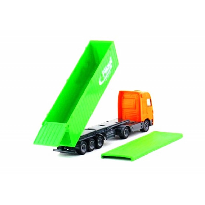 Macheta "Camion Mercedes cu remorca Fliegl" de la Siku, nu este o jucarie simpla ci si o macheta din metal foarte realistic, robust cu detaliile aferente fratelui sau original.